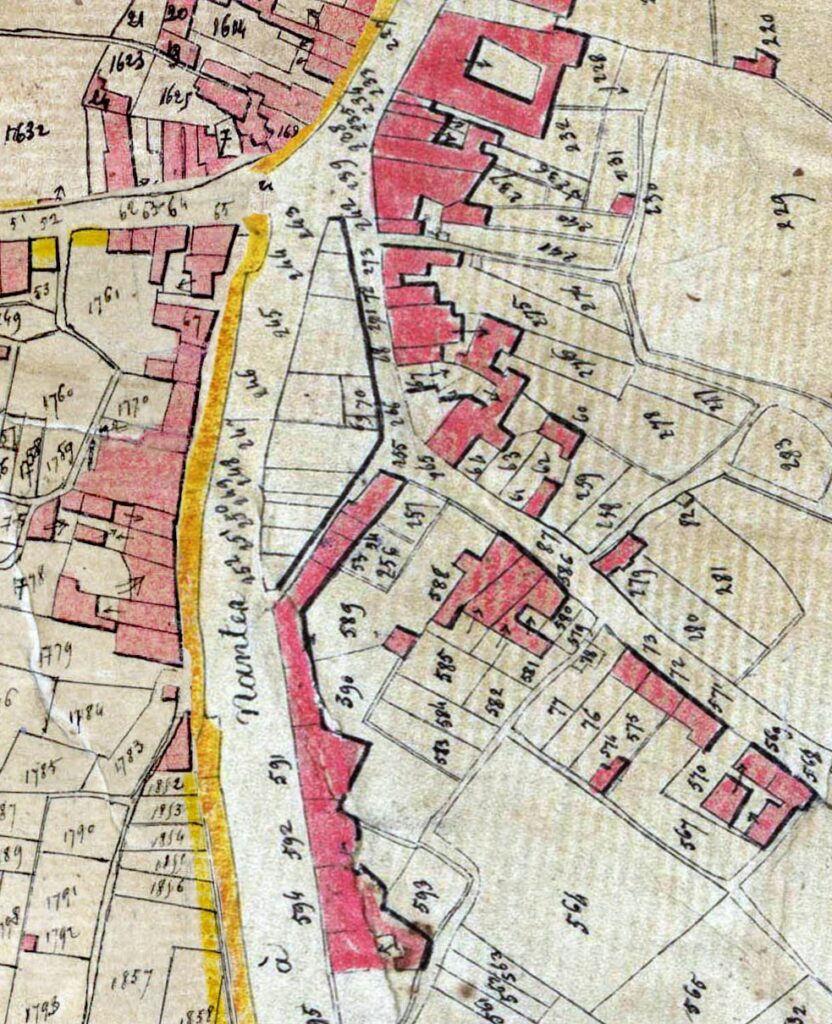 Le plan Cacault de 1755, voir photothèque, dessine l’accès de la ville de Nantes par le sud jusqu’à la chaussée de la Madeleine, en passant par le pont de la Madeleine sur la Loire, Petite Biesse, le pont de la boire de Toussaint, Grande Biesse et le couvent des Récollets, le pont de la boire des Récollets, Vertais, le pont de Pirmil sur la Loire, la forteresse et Dos d’Ane, le pont Rousseau sur la Sèvre. Quasi pas de construction sur tout l’itinéraire: une seule sur la chaussée de Pont Rousseau.