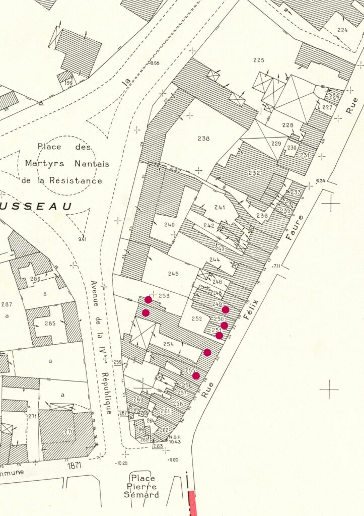 côté droit, au 28, Louis Cormerais est fabricant d’eau gazeuse en 1936; il paie 80f de cote mobilière. y résident 5 ménages dont Mme Cormerais veuve née Saillant qui paie 100f de cote mobilière, un manœuvre aux glacières de Bretagne et son fils imprimeur, un chauffeur chez Reffé et sa femme couturière, un manœuvre aux Chantiers de Bretagne et sa femme biscuitière, un mouleur chez Voruz et sa femme blanchisseuse. En 1951, Mme veuve Godin est épicier regrattier et paie 40f de cote mobilière