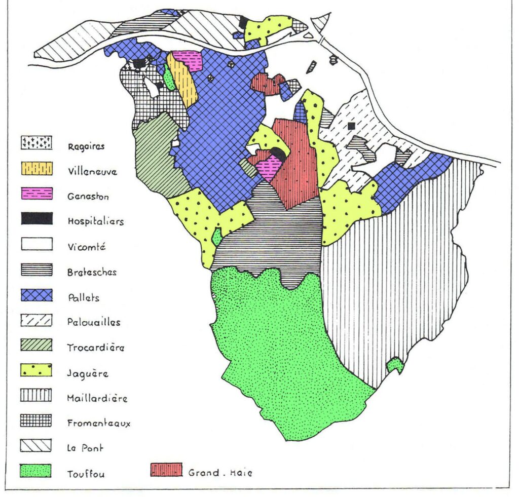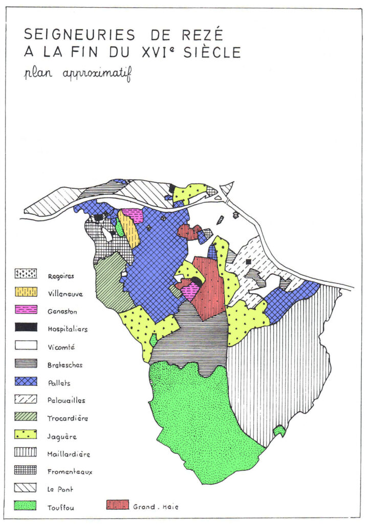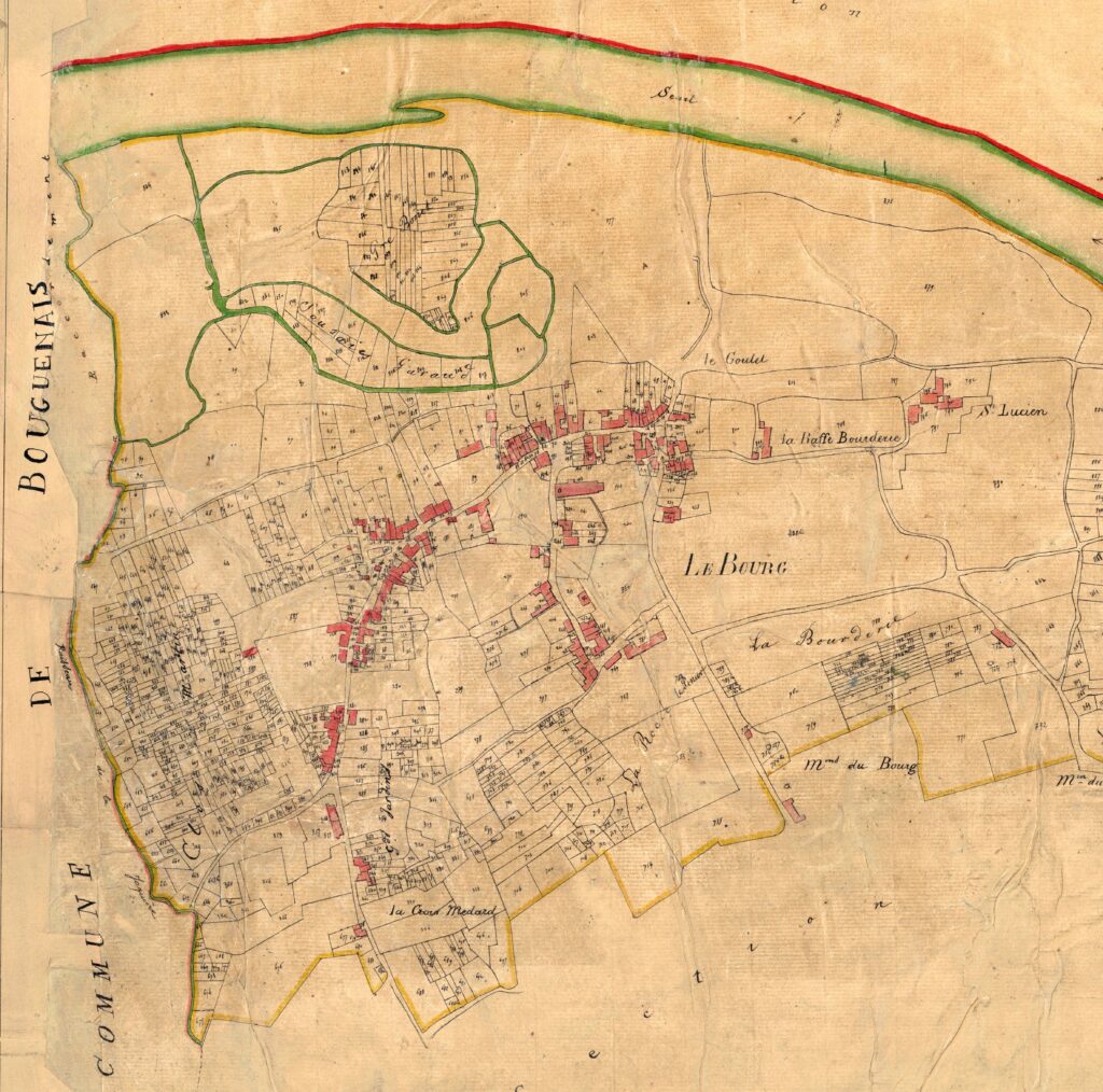Le parcellaire est très découpé, à l’ouest, dans les Champs Saint Martin et au sud vers la Croix Médard. Des archéologues affirment qu’ils y retrouvent des limites antiques. Pourtant, la découverte de la basilique paléochrétienne en 2002 n’était pas prévisible. Depuis des siècles, les paysans ont retourné la terre à la bêche; ce sont les laboureurs à bras qui vivent de peu. Vers l’est et le centre du bourg, les parcelles sont plus vastes: étaient-elles propriété des seigneurs des Pallets ou des Fromentaux ou des abbayes de Geneston ou de Villeneuve qui y plaçaient des métayers? Les prés inondables appartiennent à de grands propriétaires. Après-guerre, la famille Peigné est propriétaire des espaces autour de la chapelle Saint Lupien du XVème siècle, des Bourderies, du logis de la petite Bourgeonnière et de son jardin où ont été découvertes les 2 domus du II ème siècle. Un boulevard, dit Le Corbusier, permet de passer à côté du bourg depuis 1970.