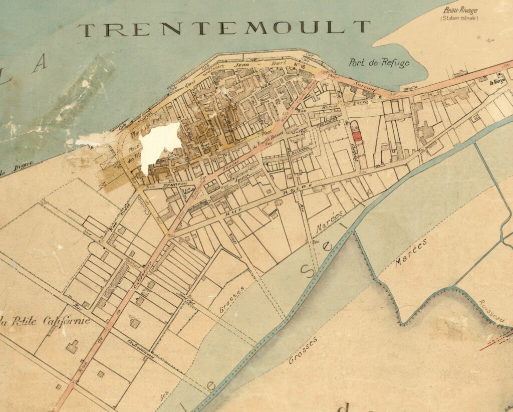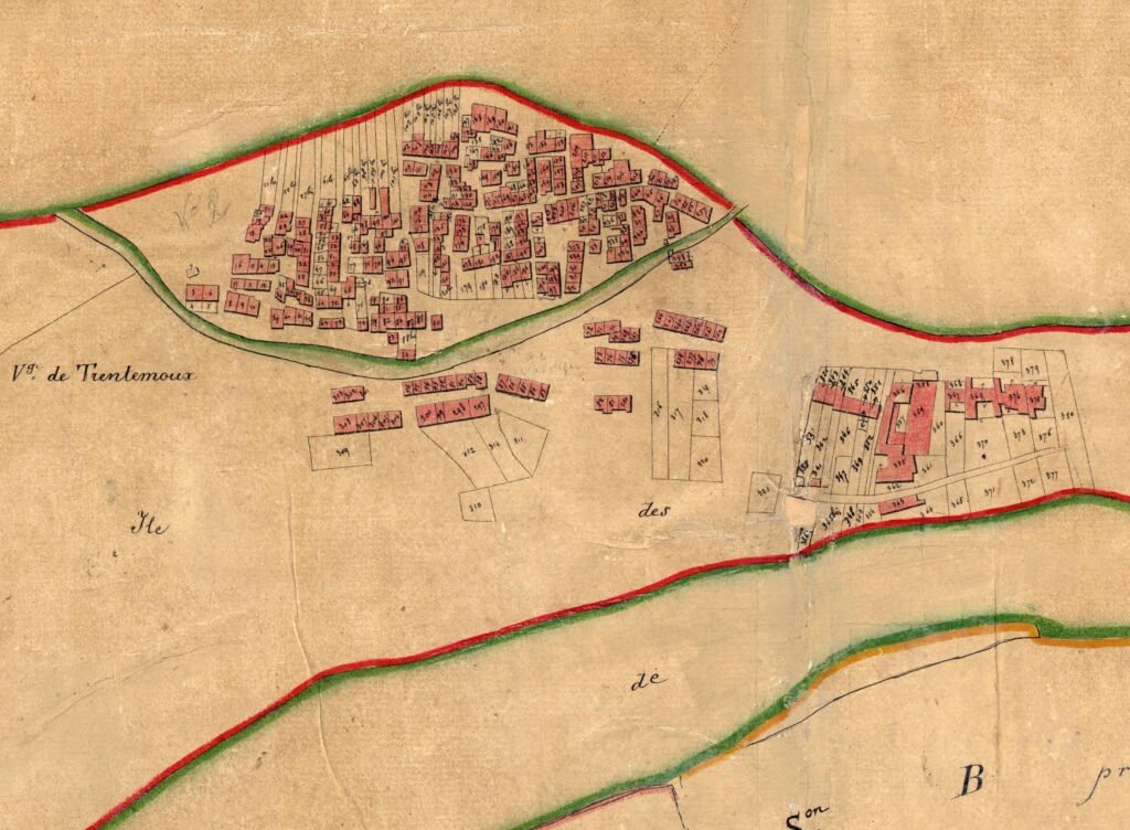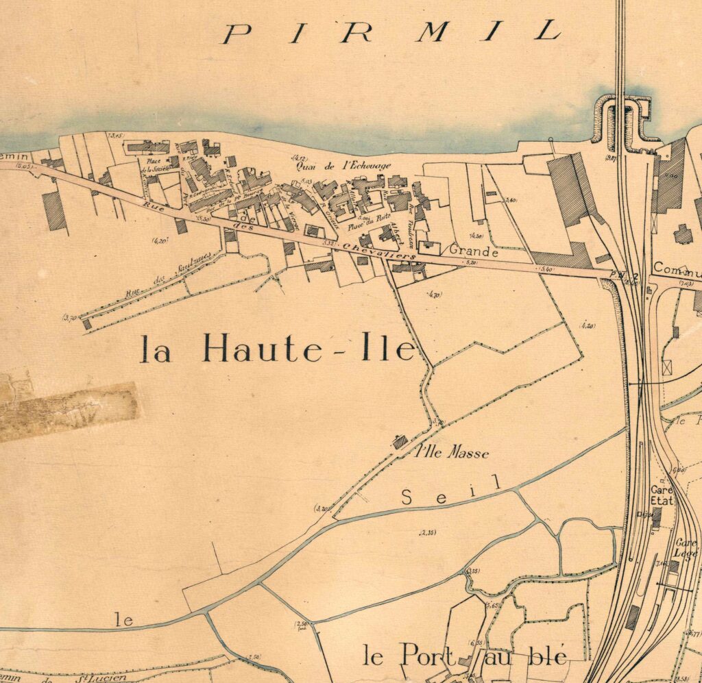 Trentemoux et les iles sont isolés du reste de Rezé par un vaste Seil ; aucun pont et même aucune trace de passeur n’apparait. Le noyau central de Trentemoux est bien identifié limité par le Courtil Brisset, des maisons mitoyennes et imbriquées photo à droite ci-dessous. Le quai Jean Bart n’est pas complet; la place des Filets est un délaissé. A l’est, les implantations sur le quai Surcouf sont conséquentes et ressemblent à des chantiers (358-359 et 355-356-357). Des maisons apparaissent vers les rues Agaisse, Lebreton et Toussaint, future Pierre Douillard, alignées, parallèles au fleuve. Norquiouse a des maisons éparses et un boisement conséquent en rive. La Basse Ile a déjà 2 groupes de maisons et la Haute Ile a de nombreuses maisons groupées. Les prés inondables ont de multiples propriétaires ; certains accès à la Loire sont des jardins privés ou oseraies.