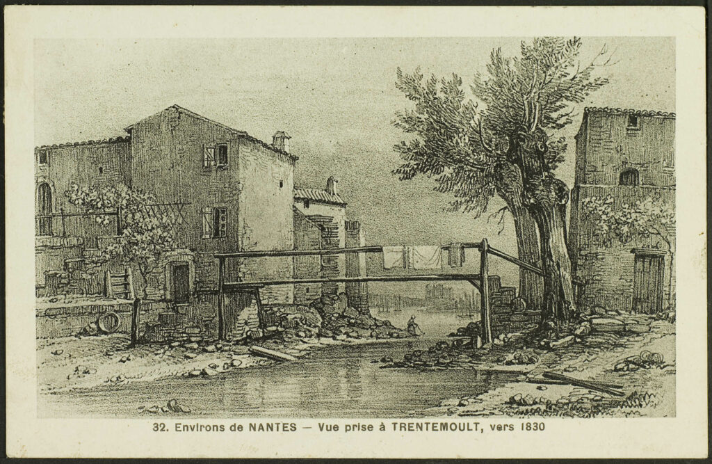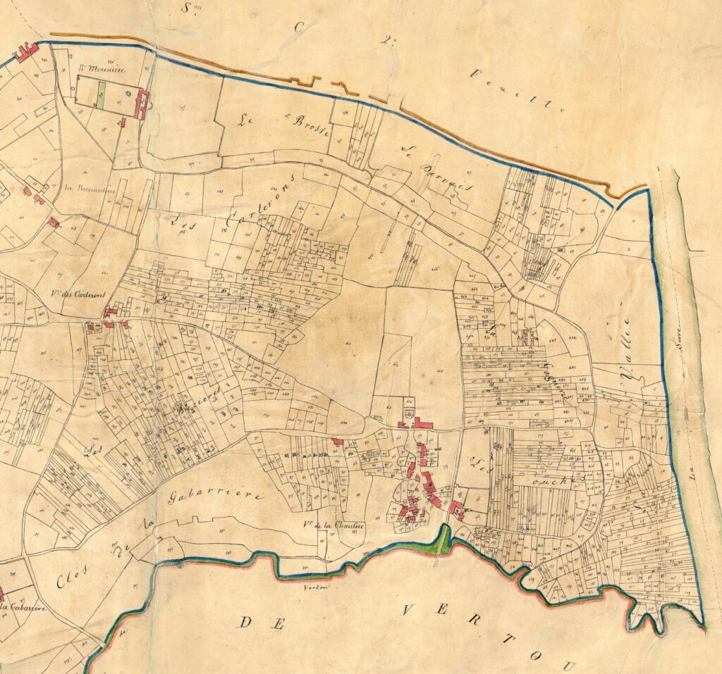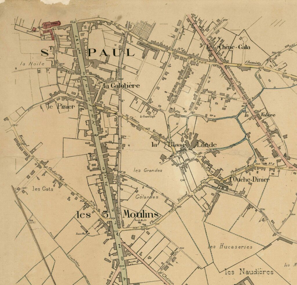 Sur le côteau, La Basse Lande se prolonge vers le sud-est sans se connecter aux 3 moulins en direction de la Blordière. Le parcellaire foncier est assez découpé autour de ces hameaux, signe d’une appropriation par les paysans. Quand Suzer ouvre la tannerie du Petit Choisy, à La Morinière vers 1845 et quand Devin ouvre celle de la Rousselière, sur Vertou en 1850, les employés se logent dans La Basse Lande, La Blordière, La Chaussée et La Morinière (lire l’histoire du quartier Blordière au début du site). Les terres restent en exploitation agricole.