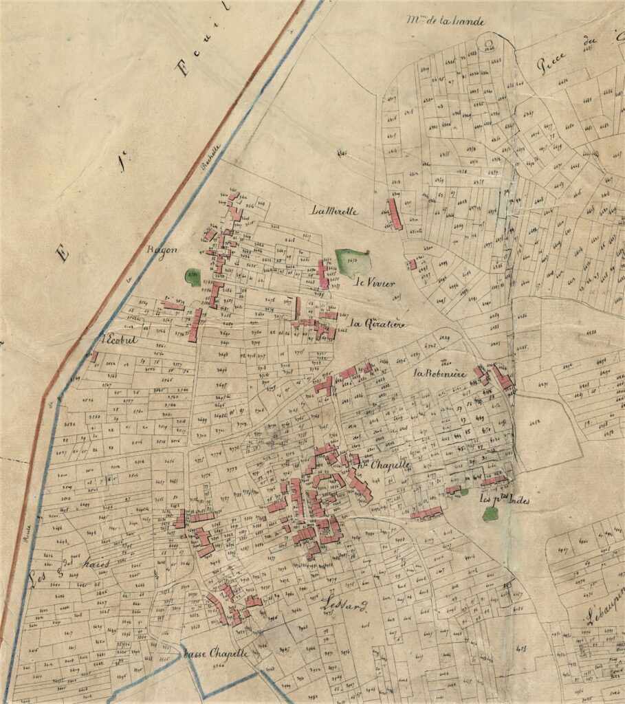 A côté de la Nationale, des maisons rurales sont implantées depuis plusieurs siècles : le long de l’actuelle rue de l’Etang, à la Mirette, face à la future école, en 3 ilots à la Quératière. La rue des Genêts est déjà tracée et rejoint le lieu dit La Robinière, sur la rue de la Mirette actuelle. Deux grandes mares apparaissent ; celle de la Quératière viendra plus tard.