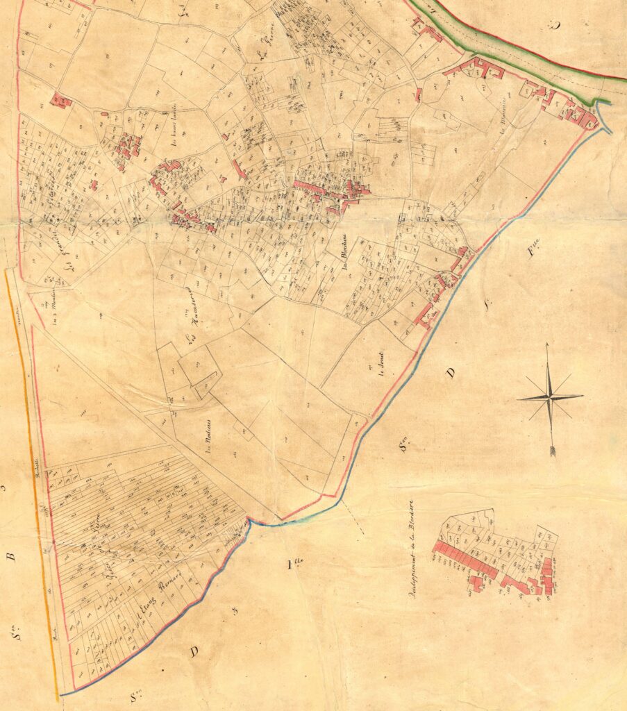 Le cadastre de 1826 nous montre la structure de la commune héritée de l’Ancien Régime ; la Révolution, l’Empire et la Restauration ont reconstruit ce qui avait été détruit sans ajout majeur. Le plan communal de 1934 présente les îles quasi-achevées et une continuité d’urbanisation sur toutes les rues de Pont Rousseau, jusqu’à la Basse Lande. En dehors de ces 2 quartiers, les nouvelles constructions sont rares, même dans le bourg. La présence des maisons nobles reste forte. Le découpage foncier varie d’un village à l’autre et illustre l’organisation rurale jusqu’en 1945. Quelques lotissements autorisés à partir de 1938 ne vont produire leurs effets qu’après la guerre. Les ex-terres nobles commencent à être urbanisées à partir de 1950 et certaines ne le seront qu’en 1990. Regardons le cadastre de 1926.